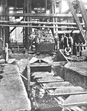 In July 1916, the DL&W announced plans to build a new concrete breaker, and to fill in part of Toby's Creek so as to straighten the railroad bed leading to the breaker.[95] By 1917, the new breaker was under construction. The foundation was built by Curtis Construction Co. of New York, and the steel frame built by the DL&W. The facade of the breaker was clad with special high-strength wire glass. The new colliery had its own power plant fueled by coal from the mine.[96] In 1936, the Glen Alden Coal Co., successor to the DL&W, operated the Woodward and produced 858,711 tons of coal. In 1945, they produced 745,586 tons. The Woodward coal breaker closed for business on October 14, 1961.[97]