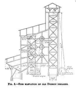 The Dodson Colliery was located at Bull Run in Plymouth Borough, and its breaker stood alongside the tracks of the Lackawanna & Bloomsburg Railroad. The Dodson's coal lands ran from Center Avenue on the west to Pierce Street on the east, and thus the Dodson's mining operations took place beneath the central business district of the Borough. The colliery was first developed by Fellows & Dodson, Co., beginning in 1869, and by 1870 a large breaker had been built and a shaft sunk to a depth of 220 feet (67 m).[53]