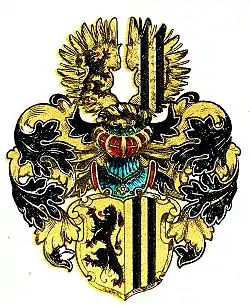 The arms of Dresden first appeared on the seal of the city in 1309. The seal may pre-date the oldest existing documents about Dresden from the early 13th century. The arms that depict the lion of Meissen and the pales of Landsberg have ever since been used by the city. The original pales were probably blue, but were later converted to black. From the 16th century the arms were furnished with a helmet and mantling, but these fell in disuse at the beginning to the twentieth century.[1]