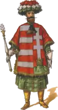 Louis I of Hungary quartered the red and white stripes of the Arpads with the double cross on the trimount. This design was also used by John Zápolya, with his family arms in an inescutcheon. |