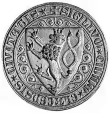 In fact, the Kladsko/Kłodzko/Glatz coat of arms was granted to the city by King Ottokar II sometime during his reign (1253–1278). The precise date and circumstances are not known, because the royal foundation charter (or its copy) has not survived. The figure of a silver lion with two tails refers to the heraldic symbol of the Kingdom of Bohemia, to which all the Kłodzko Land belonged from the 10th century until 1742–1748. The earliest image of a lion is preserved on the municipal seal originating in the third quarter of the 13th century.[1]