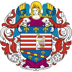 The four red stripes in the coat of arms of Košice come from the medieval coat of arms of the Hungarian Árpád dynasty.[4] The three golden fleurs-de-lis on an azure field refer to the Capetian House of Anjou dynasty,[4] and the silver eagle to the Jagiellon dynasty.[4]