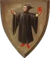 When the Munich town administration developed a constitution of its council, a seal was necessary for the purposes of asserting the authenticity of town-council documents. Appearing on a document of May 28, 1239, the oldest seal of Munich has a picture of a monk wearing an open hood.[2] While all seal impressions show the monk with the book in one hand and three outstretched fingers in the other, the monk has varied slightly, appearing in profile, then later full-faced and bare-headed. The monk as a sole heraldic figure can be found on a seal dating from the year 1304, and on flags of the city since the middle of the 14th century.[3] Colourful representations of the town's coat of arms stem from the 15th century.[2]