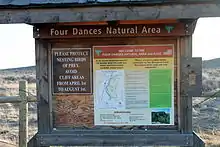 Providing an overlook of the greater Billings area, the southern portion of Coburn Hill is home to the Four Dances Natural Area, operated by the BLM. The BLM acquired Four Dances Natural Area in 1999. The area sits on 765 acres of undeveloped space which includes Sacrifice Cliffs. The area is named after Chief Four Dances, a Crow Indian chief. According to a sign on site, the area was used by Four Dances in the 1830s as a vision quest location. The area is also a frequent nesting location for various birds of prey.[7]