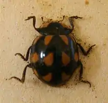 Coccinella leonina or as its common name of orange spotted ladybird suggests, has 16 yellow/orange spots on its black body,[1] with a squarish yellow/orange spot on both sides above the pronotum on the thorax[2] and then 14 other spots on its black elytra[3] which are larger and mostly separated by 1 mm diameter of the black background at the most.[2] The shade of these spots can vary on different beetles.[4] It also has a paler blotch above its eyes.[2] The legs and underside are black.[3] Its length typically varies between 4.5 and 5.5 mm long.[2][5] The elytra is an oval shape that is widest in the middle and the abdomen has slightly different shape between male and female. The abdomen is truncate in males and more rounded in females.[2] The orange spotted ladybird is a medium-sized ladybird which has a hemispheric shape.[6]