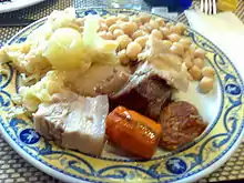 Cocido madrileño (Spanish: [koˈθiðo maðɾiˈleɲo]; "Madrid stew") is a traditional chickpea-based stew from Madrid, Spain. A substantial dish prepared with meat and vegetables, it is most popular during the winter but is served throughout the year in some restaurants. Initially it was a dish for humble people, but it started to climb in society thanks to its inclusion in restaurant menus. The chickpea was introduced under Carthaginian rule, and was later used in medieval Spain.