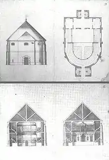 The architect commissioned for the renovation is not known for a certainty, but circumstantial evidence points to Inigo Jones. Two sheets drawn by Jones and showing the interior and exterior design of some theatre have survived; John Orrell makes the case that the theatre is the Cockpit, while allowing that he cannot produce conclusive evidence to that end.[7] (In 1629, Inigo Jones would design another "Cockpit" theatre, a private one within Whitehall called the Cockpit-in-Court or Royal Cockpit.)