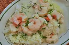 Coconut shrimp is also prepared as a sautéed or stir-fried dish using coconut milk as an ingredient.[13] This version of the dish may be served atop rice.[13] Additional ingredients can include onion, garlic, tomatoes, parsley, and various spices.[13]
