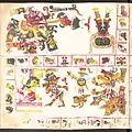 This almanac depicts the ruling deities of half-trecena periods, enthroned, receiving cult and with associated mantic images.[10]
