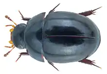 Body length is about 4.1 to 4.7 mm. Body oval, and strongly convex. Dorsum blackish whereas labrum black with yellow edges. Elytral surface densely punctate, and sutural stria reaching basal half of elytra. Mesofemora consist with sparse strong setae. Abdominal ventrite V without stout setae. In male, aedeagus has widely angulate apex, large and wide gonopore and parameres bent inwards, with a tuft of setae at the apex.[6] There is a very wide median lobe with a very large subapical gonopore in aedeagus.[7]