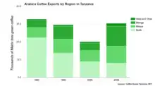 Before 1990, the State coffee board and the cooperative unions were responsible for marketing coffee. Reforms in 1990 and in 1994–95 affected export pricing.[4] Coffee wilt disease appeared in Tanzania in 1997, spreading rapidly and causing serious losses.[5]