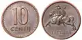- 10 centų coin: diameter - 17 mm, thickness - 1.7 mm, weight - 2.6 g. The 10 centų coin has an ornamental triangular fir tree pattern in the background. The triangle points downwards and the apex is matched to the vertical axis of the coin.