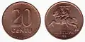 - 20 centų coin: diameter - 20.5 mm, thickness - 2.1 mm, weight - 4.8 g. The 20 centų coin has a horizontal ornamental "fir tree" pattern under the number 20.