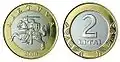 - 2 litai coin: diameter - 25 mm, thickness - 2.2 mm, weight - 7.5 g. The 2 litai coin has an edge that is divided into 5 rimmed sections parted by gaps of plain surface. 3 central bars of each section are thicker than the rest. The outside circle has an ornament formed of 2 groups of curved bars that are positioned symmetrically to the vertical axis of the coin.