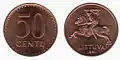 These coins are made from a gold-yellow alloy of copper, zinc, and nickel. The edges are rimmed. The coins were designed by Antanas Žukauskas with the help of Arvydas Každailis in adapting the Coat of Arms. They were released in 1997 and replaced the 10, 20, and 50 centų coins released in 1991. They bear the year in which they were produced in.