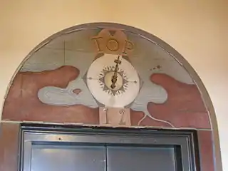 After most of the Coit Tower murals had already been completed, the 1934 West Coast waterfront strike, much of which was taking place nearby at the foot of Telegraph Hill,[25] caused government officials, shipping companies, some union leaders and the press to raise fears about communist agitation.[22] This "red scare" has been identified as playing a "crucial role" in a subsequent controversy that mainly focused on two of the murals; the first being a set of three small frescoes where Clifford Wight portrayed capitalism, the New Deal and communism, the three prominent economic systems of the era, with the communism part containing a hammer and sickle and the caption “Workers of the World Unite.”[22] The second was John Langley Howard's Industry mural (designed with the support of his architect brother Henry Howard), which depicts California industrial scenes including out-of-work men, and angered conservatives by showing a banner of the communist periodical Western Worker above a crowd of workers.[25][26][22] On June 23, 1934, the conservative banker Herbert Fleishhacker, the most powerful member of the committee allocating funds from the Public Works of Art Project, asked Heil to inspect the art, who telegraphed back that some artists had included "details ... and certain symbols which might be interpreted as communistic propaganda,” and that "editors of influential papers ... have warned us that they would take hostile attitude towards whole project unless those details be removed."[22] The official opening of the tower, planned for July 7, was canceled and Fleishhacker ordered to close the tower and to block the view from outside through the windows.[22] Subsequently, articles in the San Francisco Chronicle and The San Francisco Examiner attacked the project, sometimes using misleading representations of the artworks in question, while Wight refused to remove the hammer and sickle symbol from his mural.[22] However, federal government officials decided that the offending parts would need to be painted over, and 16 of the artists signed a statement saying that they opposed the hammer and sickle symbol and that it “has no place in the subject matter assigned.”[22] Eventually, only the hammer and sickle and the "Western Worker" banner were removed, and Coit Tower opened on October 12, 1934.[22]