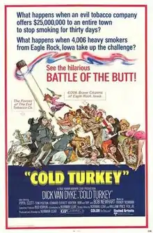 Cold Turkey is a 1971 satirical comedy film. It stars Dick Van Dyke plus a long list of comedic actors. The film was directed, co-produced and co-written by Norman Lear and is based on the unpublished novel I'm Giving Them Up for Good by Margaret and Neil Rau.