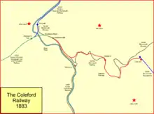 The Severn and Wye Railway station at Coleford had been opened in 1875.[11] The two stations, of the Severn and Wye and the Coleford Railway, were adjacent and there were shared sidings for the transfer of goods wagons, but through running was not possible; in fact a complex backshunt was involved to work vehicles through.[2]