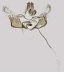 The wingspan is 10–15 mm. The moth's head is white, as are the antennae which are ringed with pale brownish. It has a basal joint with rather short tuft. The labial palps and forewings are also white. The veins are faintly yellowish-tinged, near apex more fuscous ; costal edge anteriorly finely dark fuscous, near apex more strongly; costal cilia fuscous or dark fuscous except at base and tips. Hindwings rather dark grey.[2] Only reliably identified by dissection and microscopic examination of the genitalia.