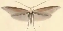 The wingspan is about 20 mm. Adults are ochreous with several whitish streaks on the forewing and distinctively thickened bases to the antennae. Adults are on wing from June to July in western Europe.[2]