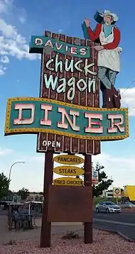 Around 1914 West Colfax was paved with concrete and designated a state highway, and it continued evolving into a major commercial thoroughfare of the region. During Prohibition it began showing signs of more colorful notoriety when scofflaw roadhouses such as Twilight Gardens operated along the thoroughfare. In 1937 the Works Progress Administration completely paved and modernized the highway, and built a new western route which took it over the hill and across ranch land to the entrance of Mt. Vernon Canyon, its present route. Around this time Colfax was designated U.S. Highway 40. From there on, commercial development boomed, including numerous motels, automobile dealerships, restaurants and more. After World War II it was a classic neon-lined highway for natives and travelers of its era; among its landmarks was Davies Chuck Wagon Diner, brought there in 1957 by restaurateur rancher Lyman Davies. The diner is also listed on the National Register of Historic Places. In 1956, two shopping malls, Westland and the JCRS Center, were built along Colfax, introducing major department stores and groceries to the area. At its far west end, at the base of the mountains, the Magic Mountain theme park was built, among the first of its kind in the world. The theme park, like many of its era, collapsed, but was resurrected in the 1970s as Heritage Square.