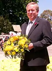 The Court government was defeated at the 2001 election. Court had a somewhat frosty relationship with Barnett and wanted to keep him from becoming leader of the opposition. While Court was from the conservative wing of the state Liberal Party, Barnett is from the moderate wing. Court engineered a plan to have federal MP Julie Bishop succeed him instead. Under Court's plan, both he and Barnett would have resigned from the state legislature. Bishop would have resigned from federal parliament and handed her seat of Curtin, the safest Liberal seat in the Perth area, to Barnett. Bishop would have then run in either Barnett's seat of Cottesloe or Court's seat of Nedlands, both reckoned as comfortably safe Liberal seats. Court would then hand leadership of the WA Liberals to Bishop once she was safely in state parliament.[8] When Barnett found out about the plan, he claimed to have "choked on his Weet-Bix" at what he described as "an act of treachery or deceit."[9] However, when Bishop rejected the plan, Court, finding himself in an untenable situation, resigned.[10] Barnett then took the leadership after defeating his only opponent Rod Sweetman.