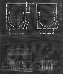 The building had 4 stories of box seating, it contained seating on the ground floor, a stage, and services.[1]