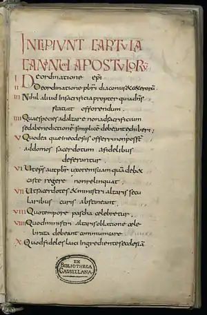![]() Folio 2r from Kassel, Landesbibliothek und Murhardsche Bibliothek, MS 4° theol. 1, showing the beginning of the Collectio conciliorum Dionysiana I | |