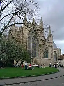 South of the Minster, the south-west side was built up with houses. Two were demolished in 1862, and College Green was created. The remainder were demolished between 1905 and 1937 in order to enlarge College Green. In 1955 the road was realigned a little further south-west and the green was enlarged,[1] while a sundial originally from Drakelow Hall was erected on the green.[3]
