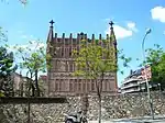 On one of the long façades is a small porch close to the square, which rises two more floors forming gazebos, enclosed by brick latticework with small colored ceramic circles. The entrance door of this porch, formed by a parabolic arch, has a wrought iron gate, which is in line with the dragon door of the Güell pavilions, although its design is simpler. The coat of arms of the order appears in several places. Instead, there are virtually no ornamental elements, but constructive solutions.[1]