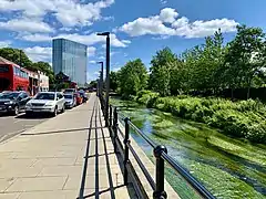 ![]() The River Wandle at Merton High Street, with Colliers Wood Tower behind | |
