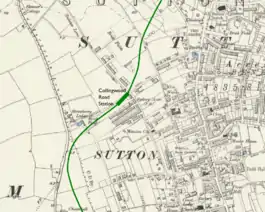 The station was to have been built on the W&SR's planned surface railway line in Surrey (now south-west London) from Wimbledon to Sutton.[1] The station was to be near the junction of Collingwood Road and Sydney Road.[2] The construction of the railway was approved in 1910.[3] In 1911 the UERL agreed to provide funding for the line's construction and to operate its train services by extending the UERL's District Railway (DR) from Wimbledon station.[2]