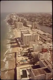 ![]() Collins Waterfront Architectural District, looking north along Indian Creek, with Fontainebleaus I and II and the Blue and Green Diamonds in the foreground. The Akoya is visible in the far distance. The Atlantic Ocean (not pictured) is to the east. | |