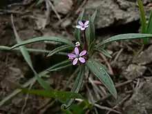 Collomia tinctoria is a species of flowering plant in the phlox family known by the common name staining collomia. It is native to the western United States from Washington to Montana to California, where it grows in open, rocky habitat in mountains. It is an annual herb producing a slender, branched stem no taller than about 8 centimeters. The glandular, hairy leaves are lance-shaped. The inflorescence is composed of two or three flowers emerging from the leaf axils. Each flower has pointed sepals tipped with awns. The flower has a purplish tube and a pinkish corolla.
