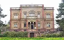 The "Colombischlössle" (Colombi castle) was built between 1859 and 1861 on the terrain of the former bastion Saint Louis of the town fortification of Freiburg, which had been filled in 15 metres and converted to a garden.[1] Duches Maria Antonia Gertrudis von Zea Bermudez y Colombi was the one who commissioned the castle. She wanted the building to be her widow's residence. The plans were made by the Freiburg architect Georg Jakob Schneider, who chose the gothic Tudor-style of the English medieval times as inspiration for the historicist mansion. Additionally, he was inspired by his teacher, Friedrich Eisenlohr, who had rebuilt Ortenberg Castle in this style.[2] It cost about 300,000 Goldmark, 750 per square metre.[1] The historic stairwell, the parquet flooring and a light glass cupola roof, still show the former prosperity of the duchess Maria Antonia Gertrudis de Colombi y de Bode (1809–1863).