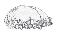 The genus is only known from a single jawbone with some teeth, found by Texas Petroleum in 1945, a specimen approximately 9 centimetres (3.5 in) in length, recovered from the Late Eocene middle part of the Gualanday Group on the San Pedro finca, Alto San José, Chaparral, Tolima. The teeth, molars and premolars of a kind known as bilophodont, which are present in the pyrotheres - were considered as evidence that this genus could be an ancestor of the advanced pyrotheres as Pyrotherium.[3] Colombitherium has first been described by Hoffstetter in 1970,[3] with a revised interpretation published by Billet et al. in 2010.[4] The detailed descriptions by Billet et al. show the differences between Colombitherium and other pyrotherians: the features of the bilophodont teeth of Colombitherium are actually found in several groups of placental mammals, which implies that Colombitherium and another possibly related taxon, Proticia could not be part of Pyrotheria. The authors maintain "the referral of Colombitherium to Pyrotheria is therefore weakly supported, and it must be considered as highly hypothetical."[5] In any case, the lack of further evidence means that Colombitherium and Proticia must be classified in a separate family, Colombitheriidae which is tentatively classified as a primitive clade in Pyrotheria.