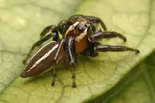 Colonus puerperus is a species of jumping spider commonly found in the eastern United States. Its range stretches along the Gulf Coast from Florida to Texas, and north to Kansas, Illinois, and Pennsylvania.[2] It is usually found in grassy areas during the warmer months of the year.[3] Adult females are between 7 and 11 mm (0.3–0.4 in) in length.[3][4] Adult males are between 5 and 7 mm (0.2–0.3 in).[2][4]
