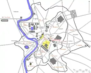 The statue was placed just outside the main palace entrance at the terminus of the Via Appia in a large atrium of porticoes that divided the city from the private villa.[1] The Greek architect Zenodorus designed the statue and began construction between AD 64 and 68. According to Pliny the Elder, the statue reached 106.5 Roman Feet (30.3 metres (99 ft)) in height, though other sources claim it was as much as 37 metres (121 ft).[2]