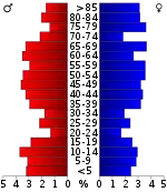 In the county, the population was spread out, with 22.10% under the age of 18, 4.50% from 18 to 24, 21.00% from 25 to 44, 26.50% from 45 to 64, and 25.80% who were 65 years of age or older. The median age was 47 years. For every 100 females there were 93.60 males. For every 100 females age 18 and over, there were 87.50 males.