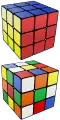 Siamese cubes are two or more puzzles that are fused so that some pieces are common to both cubes. The picture here shows two 3×3×3 cubes that have been fused. The largest example known to exist is in The Puzzle Museum [8] and consists of three 5×5×5 cubes that are siamese fused 2×2×5 in two places. there is also a "2 3x3x3 fused 2x2x2" version called the fused cube. The first Siamese cube was made by Tony Fisher in 1981.[9] This has been credited as the first example of a “handmade modified rotational puzzle”.[9] | |