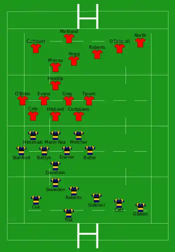 Reds flanker Beau Robinson was in the initial squad but withdrew following an injury he suffered while playing for the Reds against the Lions on 8 June. He was replaced by his Reds' teammate, Jarrad Butler.[4] The other player forced to withdraw from the squad due to injury was NSW Country flyhalf Ben Greentree. He was replaced in the starting lineup by Queensland Country player Shaun McCarthy, with fellow Queensland Country player Rory Arnold brought into the lineup on the bench to complete the squad.[4]