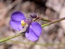 The habitat is sandy soils in heathland or low eucalyptus country, sometimes in high rainfall areas. The specific epithet sphaerocarpum is from the Ancient Greek, referring to the ball-shaped fruit. The attractive violet or blue flowers form from October to May. The width of the flower is around 1 cm (0.5 in). The fruit is somewhat broadly triangular or round, and tapers to the stem, although not as prominently tapered as are other plants in this genus.[7] The fruit is 4 mm long.
