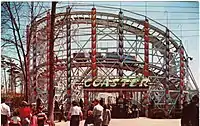 The coaster, originally named Cyclone, was designed by Edward Leis and Vernon Keenan and built by National Amusement Devices. The ride was 3000 feet long, and had a top speed of 55 mph and lasted two minutes and ten seconds. It had two trains, each with five cars, arranged with two per row, two rows per car, for a total of 20 riders per train.