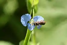 The flowers are arranged into cincinni (singular: cincinnus), or scorpioid cymes. This is a form of a monochasium where the lateral branches arise alternately on opposite sides of the false axis. There are typically two cincinni present, with the lower cincinnus bearing 2 to 4 flowers, while the upper cincinnus has one to several flowers. The upper cincinnus is generally exerted on specimens with larger spathes, but it may be included in specimens with smaller spathes.[2] The upper cincinnus bears only male flowers and has a longer peduncle, while the lower cincinnus bears bisexual flowers on a shorter peduncle. The pedicels supporting single flowers, and later the fruits, are thick and curved and measure about 3 to 5 mm. The membranous sepals are inconspicuous at only 3 to 4 mm in length.[3] The petals are blue, though may be lavender in rare cases.[2] The upper two petals measure 4.2 to 6 mm.[3] The anther connective (i.e. the tissue connecting the two halves of the anther) of the centre-most stamen has a broad transverse band of violet. The spathes are solitary, borne on a peduncle and typically falcate (i.e. sickle-shaped) with a cordate (i.e. heart-shaped) to rounded base, acuminate apices and can be either glabrous or hispidulous (i.e. minutely hispid) beneath. They usually measure 0.8 to 2.5 cm long, but may be as short as 0.5 cm and as long as 4 cm. They are typically 0.4 by 1.2 cm wide, but may be up to 1.4 cm long. Their peduncles are usually 0.5 to 2 cm long and rarely up to 2.9 cm.[2][3] Flowering occurs from May to November.[3] Pollens are elongated with bilateral symmetry, approximate size is 73 microns.