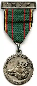 The circular silver medal bears on its obverse the relief left profile of a wild boar's head surrounded by a 3mm wide ring along the entire medal's circumference and bearing the relief inscription "3 CHASSEURS ARDENNAIS" in the upper half and "125 km" at the bottom. The reverse bears the relief inscription on four lines "MARCHE" "DU SOUVENIR" "ET DE L'AMITIE" "ARLON-VIELSALM". The medal hangs from a ribbon secured by a hook through a suspension loop at its top. The medal is secured to clothing with a safety pin backed metal clasp displaying in relief the year of the event, or in the case of older medals, the inscription M.S.A. or M.S.E.A.. The ribbon is dark green with the national colours of Belgium in three narrow 1mm edge stripes and two narrow 1mm wide red stripes centered 1 cm apart on the green field.