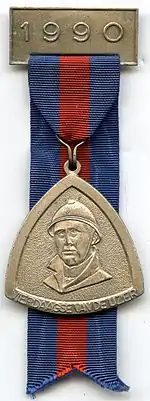 The medal is round or triangular, made in silver or bronze, and showing the imprint of a World War I Belgian soldier, but the shape of the medal can change every five years. The ribbon is dark blue with a large vertical scarlet stripe. Small metal bars are added to the ribbon when the bearer has completed the march more than one time.