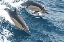 There have been confirmed cases of hybridization between striped and common dolphins in this region. There have been 15 cases of common dolphin and striped dolphin hybrids. Genetic and observational evidence has demonstrated that the hybrids are fertile and are capable of not only reproducing with other hybrids, but are capable of reproducing with each of the parent species.[22] Striped dolphins have been known to mate with other dolphins, as the Clymene dolphin is the result of hybrid speciation between striped and spinner dolphins. However, this is unlikely to happen with common dolphins, as their population in the Gulf of Corinth is too low.[23] Common dolphins and bottlenose dolphins have been known to interbreed in captivity. There is one confirmed case of a hybrid between a bottlenose and common dolphin in Southern Spain, an important feeding ground for both species. The mother was a female bottlenose dolphin (dubbed as Billie) who has spent 10 years within a common dolphin pod. Billie was observed assisting common calves reach the surface at three different intervals and would babysit the calves after the mother went through labor. The length of the calf was similar to a bottlenose dolphin calf, with the lateral stripes and coloration of a common dolphin. The calf was spotted with its mother, almost daily on dolphin watching tours among a nursery pod of common dolphins which also contained some immature striped dolphins. Sightings of the calf took place when temperatures were between 14-26 °C. The calf was mainly observed swimming in the echelon position (swimming alongside the mother). The calf was found rubbing its head on its mother, jumping backwards over its mother and flipper-to flipper, belly-to flipper and belly-to belly contact was observed.[24] They have also been observed bow riding on baleen whales, and they also bow ride on boats.[10] They are fast swimmers and breaching behavior and aerial acrobatics are common with this species.[7] They are also known to display altruistic behaviors to support injured members.[25][26]