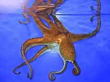 Primarily, the octopus situates itself in a shelter where a minimal amount of its body is presented to the external water.[18] When it does move, most of the time it is along the ocean or sea floor, in which case the underside of the octopus is still obscured.[18] This crawling increases metabolic demands greatly, requiring they increase their oxygen intake by roughly 2.4 times the amount required for a resting octopus.[19] This increased demand is met by an increase in the stroke volume of the octopus' heart.[20]