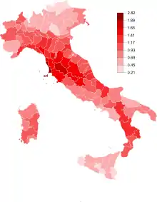 Support for the Communist Party is stronger in central Italy in particular in Tuscany and Umbria. The party ran in all the constituencies of Italy for the first time in the 2019 European Parliament election. It made its best results in Tuscany (1.68%), in particular in the province of Livorno (2.82%) and in the province of Siena (1.89%), while it was weaker in South Tyrol (0.21%), Trentino (0.49%), and Sicily (0.46%).[33]