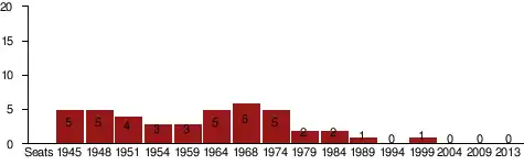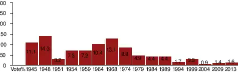 In 1964, the United States State Department estimated the party membership to be approximately 500.[1] In legislative elections held in the same year, the party registered 10.4% of the vote, and won five of the Chamber of Deputies' 56 seats. The party's representation in the Chamber peaked at the following election, with six deputies, but fell, until the KPL lost its last remaining deputy in 1994. In the same year a minority opposing the Marxist-Leninist line of the party split and founded the New Left (Luxembourgish: Nei Lénk) together with the rest of the Revolutionary Socialist Party (Luxembourgish: Revolutionär Sozialistesch Partei).